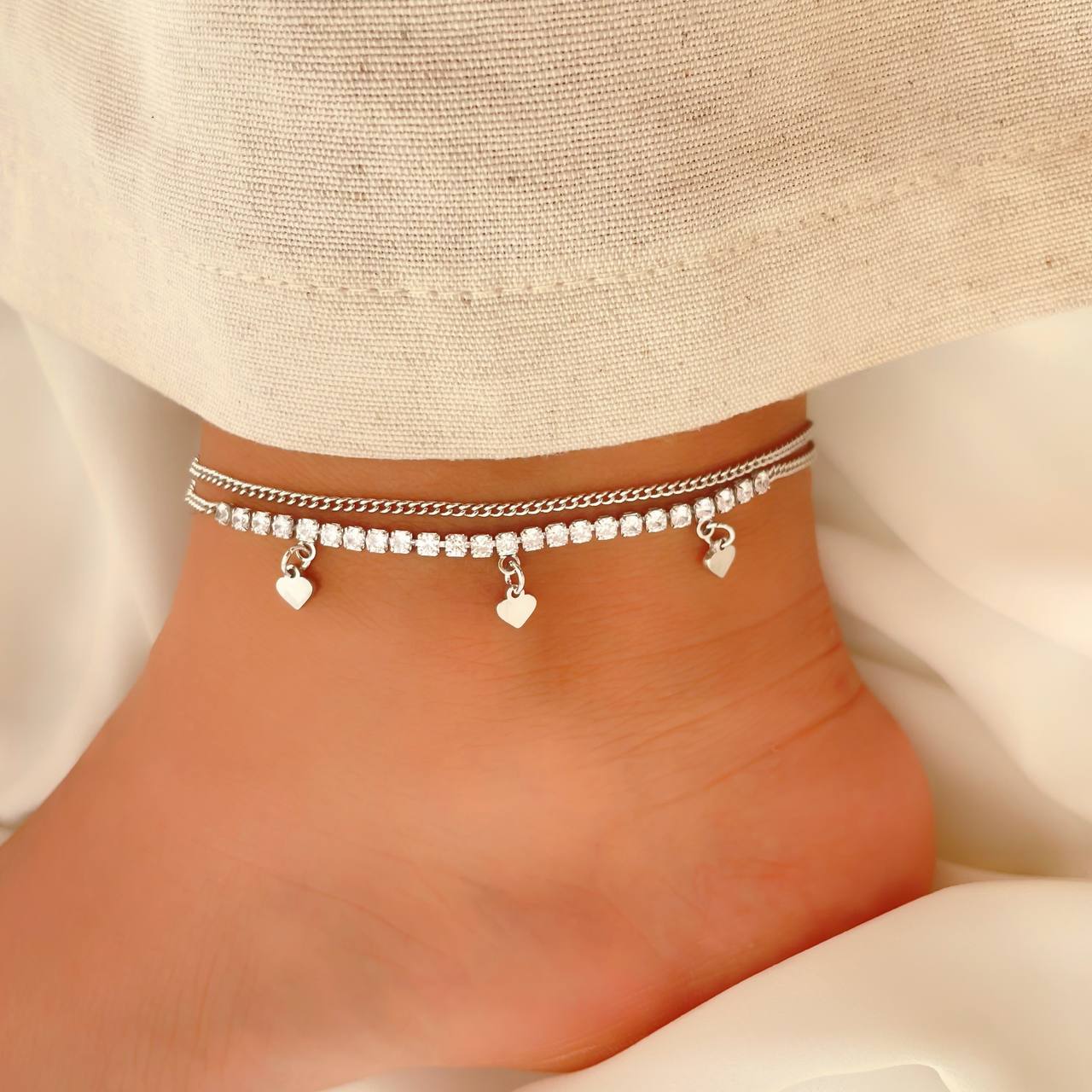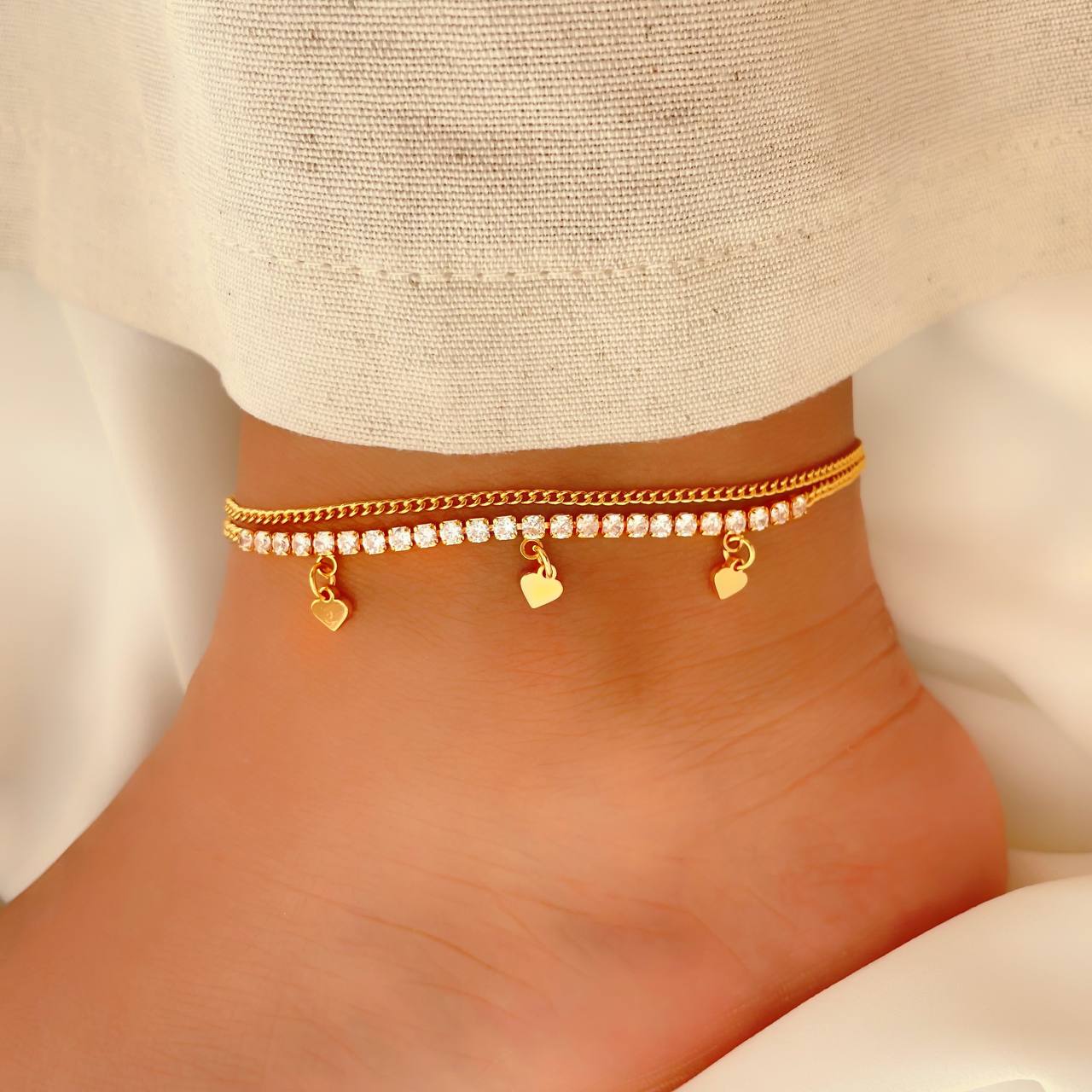 این پابند شیک از جنس استیل با آبکاری طلا ساخته شده و دارای دوام رنگ متوسط است. طراحی آن شامل دو ردیف زنجیر ظریف است که در یکی از آنها ردیفی از نگینهای درخشان قرار گرفته و جلوهای لوکس و خاص به آن داده است. همچنین، آویزهای قلبی کوچک که در امتداد پابند قرار دارند، زیبایی آن را دوچندان کرده و حس لطافت و جذابیت را القا میکنند. این مدل در دو رنگ طلایی و نقرهای موجود است و انتخابی عالی برای کسانی است که به دنبال اکسسوریهای چشمنواز و مدرن هستند.